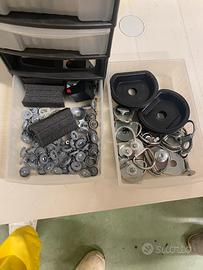 Vendo pannelli di rivestimento in legno tappezzati nuovi con vari accessori( ganci sia su pannelli laterali e 4 ganci ripiano inferiore)