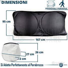 PARASOLE per Parabrezza Auto Interno 167x95, Piegabile e Portatile, in Nylon, Color Argento Riflettente e Tessuto Nero | Respinge il 99% dei Raggi UV e Calore Mantenendo Fresco L'abitacolo. Disponibile in 6 Taglie. - DIMENSIONI PERFETTE | Isola Perfettamente il Parabrezza da un'Estremità all' altra, grazie alla Struttura Elastica Basata su 2 Lamelle IN ACCIAIO Circolari. - PROTEZIONE | Trasmette l'1% di Luce Visibile, Offrendo ad Abitacolo, Cruscotto e Dispositivi una Protezione dai Raggi UV fino al 99% - ISOLANTE TERMICO | Nylon Argento Respinge il Calore, il Tessuto Nero Interno Isola, Dando una Percezione di Fresco, Mantenendo Temperature più Basse di +/-40°c - FACILE TRASPORTO | Facilmente Richiudibile, occupa soli 27Cm x 26Cm x 2Cm, Rendendolo Facilmente Riponibile Ovunque COMPATIBILITÀ: - Parabrezza Anteriore o Posteriore 157x85 Circa (+/- 5%) APPLICAZIONE: - Aprire Parasole pieghevole e Installare dalla parte interna del parabrezza con Il Lato Argentato rivolto verso l'esterno. - Incastrare il Parasole Tra La fine del Parabrezza e le alette Parasole da Aprire a Contrasto. - Per la Chiusura è Necessario formare un 8 con i 2 anelli circolari Piegati e Ripiegarlo in fine su sé stesso. DETTAGLI TECNICI: - Dimensioni Aperto: 167 x 95 Cm - Dimensioni Chiuso: 27 x 26 x 2 Cm - Materiale: Poliestere Nylon, Tessuto, Struttura in Acciaio - Colore: Nero - Argento - Protezione Raggi UV: 99% - Interferenza Segnali GPS Satellitare, Cellulari: 0% - Surriscaldamento Abitacolo: -90% - Luce Visibile Riflessa Interno: 1% - Tot Energia Solare Respinta: 99% - Riduzione Guadagno Termico: 60% - Spessore: 3mm - Installazione: Ad Incastro PER INFO CONTATTARE AL 3927091031 ANCHE LINEA WhatsApp OPPURE VIA E-MAIL: rtautoitalia2018@libero.it CONSEGNA: - Effettuiamo Spedizioni 24-48H in TUTTA ITALIA - Ritiro in Sede con Possibilità di Visionare il Prodotto - Vendiamo solo Articoli Nuovi PAGAMENTI: - PayPal - Con Carta - Bonifico Bancar