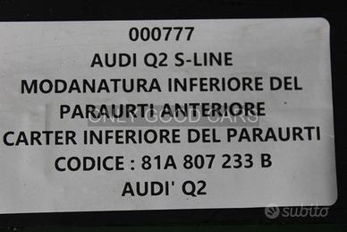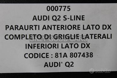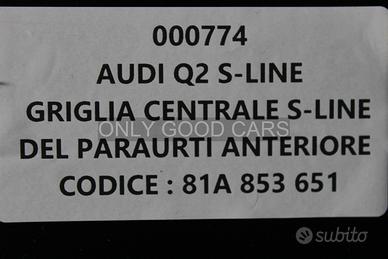 Ricambi Auto Usati ---SOLO RICAMBI ORIGINALI --- NO PERDITEMPO Recapito telefonico: +39 3533122170 anche WhatsApp. * PARAURTI ANTERIORE S-LINE COMPLETO DI GRIGLIE LATERALI CON PREDISPOSIZIONE PER 4 SENSORI DI PARCHEGGIO ( PDC ) . COD. OEM : 81A 807 438 * GRIGLIA CENTRALE DEL PARAURTI ANTERIORE S - LINE . COD. OEM : 81A 853 651 * MODANATURA INFERIORE / CARTER INFERIORE DEL PARAURTI ANTERIORE COD. OEM : 81A 807 233 B COLORE : GRIGIO SCURO Compatibile con la serie: AUDI' Q2 (LCI = Restyling) Spedizione in tutta Italia, con spese di spedizione a parte, oppure ritiro presso le nostre sedi di Roma e Pomezia. ART. 000774 / 000775 / 000777 C
