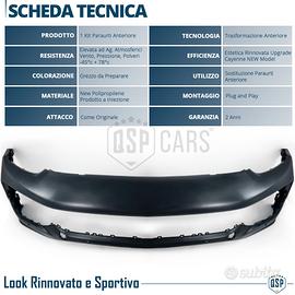 KIT PARAURTI per Porsche Cayenne 2 Restyling(2014-2017), Trasformazione in Nuovo CAYENNE TURBO GT 2025 | Ricambio PerfettoPLUG and PLAY '' Per la Trasformazione Completa in GT TURBO 2025 Vedi il Kit Carrozzeria FARI+ PARAURTI " - Look Rinnovato e Sportivo | Trasformazione Cayenne 2 in Cayenne GT TURBO 2025 - Ricambio Perfetto | NO Adattamenti o Modifiche, Necessaria Preparazione eVerniciatura - KIT Completo | Include Luci Diurne, Frecce Integrate e Minuterie di Montaggio - Qualità Professionale | Aderenza Perfetta, Eccellenza dei Materiali, Rifinitonel Dettaglio INFO: Rinnova il Look del Tuo Porsche Cayenne 2 e Convertilo alla Versione TURBO GTdel 2025, Sostituendo il Paraurti di Serie con Quello Ispirato alla VersioneSportiva dell'Ultimo Modello Porsche Cayenne. COMPATIBILITÀ: - Per Porsche Cayenne 2 DAL 2014 AL 2017 (Versione Restyling) MONTAGGIO: - Semplicemente da Sostituire all'Attuale come Perfetto Ricambio: COMPATIBLITA'TESTATA AL 100% - Da Preparare e Verniciare, necessariamente presso Professionisti del Settore(Auto Carrozzeria) PER INFO CONTATTARE AL 3927091031 ANCHE LINEA WhatsApp OPPURE VIA E-MAIL: rtautoitalia2018@libero.it CONSEGNA: - Effettuiamo Spedizioni 24-48H in TUTTA ITALIA - Ritiro in Sede con Possibilità di Visionare il Prodotto - Vendiamo solo Articoli Nuovi PAGAMENTI: - PayPal - Con Carta - Bonifico Bancario - Alla Consegna con Contrassegno