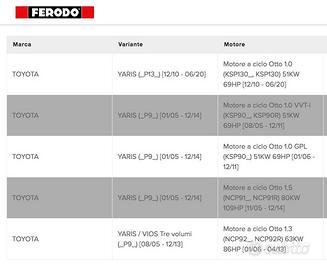 Queste pastiglie vengono montate sulle Toyota Yaris 2. serie (XP9) e 3. serie (XP13).