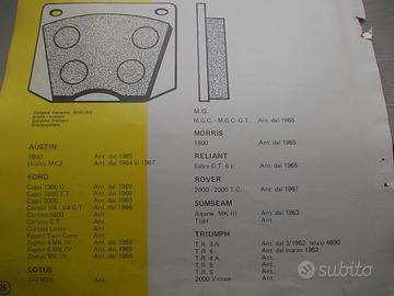 Per Triumph TR 3 A-TR 4-TR 4 A-TR 5-TR 6 e 2000 Vitesse,Austin Healey MK3,MG C- MG C GT,Ford Cortina Lotus e altri modelli,(vedi elenco in ultima immagine),vendo una serie di pastiglie per freni anteriori.