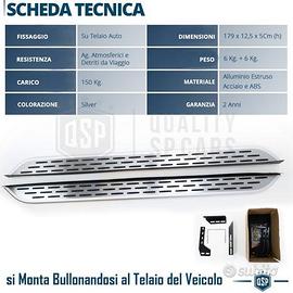 Set Pedane Laterali Sottoporta Universali, per Auto e Fuoristrada | Realizzate in Alluminio Anodizzato, con inserti Neri in PVC Antiscivolo e Bordo Satinato. Dimensioni 178 Cm x 12,5 Cm x h 5 Cm - Aderenza perfetta al Veicolo Assicurata grazie alla Aletta da 50mm in Gomma. - FUNZIONALI | Facilitano l'Accesso all' Abitacolo - ANTISCIVOLO | Inserti in PVC su Tutta la Lunghezza - COMFORT | Ampio e Comodo Appoggio - INOSSIDABILE | Resistenza Alle Intemperie Testata - STILE OFF-ROAD | Look Accattivamente Fuoristrada IL PACCO INCLUDE: 2 Pedane Laterali Sottoporta 18 Staffe di Montaggio 6 Staffe a ""U"" Filettate 1 Set Bulloneria INFO: Set Pedane Laterali Sottoporta, Realizzate in ALLUMINIO ESTRUSO, Con Inserti in PVC e Bordo Frontale Satinato. Pedane Sottoporta TOP di GAMMA nell'ambito Fuoristrada Off-Road, forniscono alla Vettura un Look Attrattivo e Accattivante, grazie alla loro Estetica di qualità eccellente, ai Materiali di Costruzione, Rifiniture del Dettaglio, Tatto e Colorazione, oltre a proteggere le Fiancate dell'Auto. COMPATIBILITÀ: - Universali, Per Auto e Fuoristrada - ALFA ROMEO - AUDI - BMW - JEEP - LAND ROVER - KIA - CITROEN - MERCEDES - MITSUBISHI - NISSAN - OPEL - PEUGEOT - PORSCHE - RENAULT - SAAB - SKODA - HONDA - HYUNDAI - SUZUKI - FORD - TOYOTA - FIAT - VW MONTAGGIO: L' Installazione di questo Prodotto è Necessariamente da Eseguire da un PROFESSIONISTA Mediante l'Installazione di un Professionista il Montaggio è Assicurato su Auto o Suv. DETTAGLI TECNICI: - Materiale: Alluminio Estruso - Colore: Silver + Parti Nere - Finitura: Anodizzata - Peso: 12Kg - Dimensioni: 178Cm x 12,5Cm x H 5Cm - Potenziale di carico: 150Kg - Confezionamento: Originale - Resistenza Schiacciamento: ELEVATA PER INFO CONTATTARE AL 3927091031 ANCHE LINEA WhatsApp E-MAIL: rtautoitalia2018@libero.it CONSEGNA: - Effettuiamo Spedizioni 24-48H in TUTTA ITALIA - Ritiro in Sede PAGAMENTI: - PayPal -