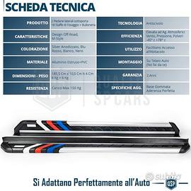 Set Pedane Laterali Sottoporta Universali, per Auto e Fuoristrada | Realizzate in Alluminio Anodizzato, con inserti Rossi, Blu, Bianchi e Neri in PVC Antiscivolo e Bordo Satinato. Dimensioni 180,5 Cm x 10,5 Cm x h 4 Cm - Aderenza perfetta al Veicolo Assicurata grazie alla Aletta da 50mm in Gomma. - FUNZIONALI | Facilitano l'Accesso all' Abitacolo - ANTISCIVOLO | Inserti in PVC su Tutta la Lunghezza - COMFORT | Ampio e Comodo Appoggio - INOSSIDABILE | Resistenza Alle Intemperie Testata - STILE OFF-ROAD | Look Accattivamente Fuoristrada IL PACCO INCLUDE: 2X Pedane Laterali Sottoporta X 18 Staffe di Montaggio X 6 Staffe a ""U"" Filettate X 1 Set Bulloneria INFO: Set Pedane Laterali Sottoporta, Realizzate in ALLUMINIO ESTRUSO, Con Inserti in PVC Colorati che ricordano i colori Bmw Motorsport e Bordo Frontale Satinato. Pedane Sottoporta TOP di GAMMA nell'ambito Fuoristrada Off-Road, forniscono alla Vettura un Look Attrattivo e Accattivante, grazie alla loro Estetica di qualità eccellente, ai Materiali di Costruzione, Rifiniture del Dettaglio, Tatto e Colorazione. COMPATIBILITÀ: - Universali, Per Auto e Fuoristrada MONTAGGIO: L' Installazione di questo Prodotto è Necessariamente da Eseguire Professionalmente Quindi da un PROFESSIONISTA Mediante l'Installazione di un Professionista il Montaggio è Assicurato su Auto o Suv DETTAGLI TECNICI: - Materiale: Alluminio Estruso - Colore: Silver + Parti Nere, Rosse, Blu, Bianche - Finitura: Anodizzata - Peso: 12Kg - Dimensioni: 180,5 Cm x 10,5 Cm x h 4 Cm - Potenziale di carico: 150Kg - Confezionamento: Box Cartone Originale - Resistenza Schiacciamento: ELEVATA PER INFO CONTATTARE AL 3927091031 ANCHE LINEA WhatsApp OPPURE VIA E-MAIL: rtautoitalia2018@libero.it CONSEGNA: - Effettuiamo Spedizioni 24-48H in TUTTA ITALIA - Ritiro in Sede con Possibilità di Visionare il Prodotto - Vendiamo solo Articoli Nuovi PAGAMENTI: - PayPal - Con Carta - Bonifico Ba