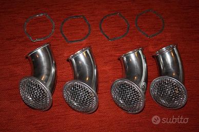 Piastra e tromboncini curvi nuovi, cavità conica (effetto venturi), in alluminio lucido, con retina di protezione e anelli per il fissaggio ad inclinazione regolabile, come da foto.