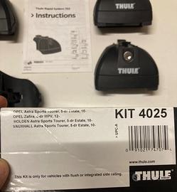 Piedi Thule per barre portapacchi e adatte per mancorrenti integrati nel tetto, Modello Rapid System 753 (piede) con pinze modello 4025 (numero completo 18402502) adatte per mancorrenti INTEGRATI di diverse vetture, prevalentemente Opel Zafira Tourer e Astra sport tourer, ma adatti anche ad altri modelli (skoda kodiac già provati, audi q3, gruppo vw con mancorrenti integrati).