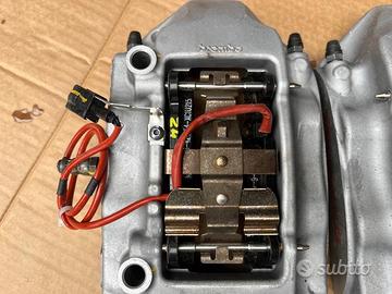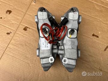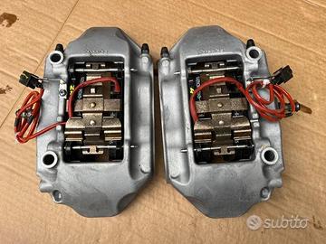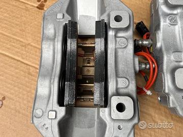 Pinze freno a 4 pompanti originali Brembo per dischi da 330mm fino a 345mm derivanti da Maserati,con staffe adatte possono montare a Alfa Romeo Giulietta Giulia Stelvio 159 Brera ecc Volkswagen Golf gti R Passat Tiguan Scirocco ecc, Audì A3 S3 Rs3 A4 S4 Rs5 A5 S5 Rs5 A6 S6 Rs6 Q3 Rsq3 Q5 Sq5 Q7 ecc, Mercedes classe A A35 A45 classe C C43 C63 Classe E classe S Gla Glc Gle ecc Skoda octavia,Seat leon fr, Ford Focus rs , Renault Megane rs ecc ecc, una coppia delle pinze complete di pastiglie, fermi ecc( come si vedono in foto) costano 599 euro, per qualsiasi informazione potete contattarmi telefonicamente o Whatsapp al 3292077195, con possibilità di spedizione
