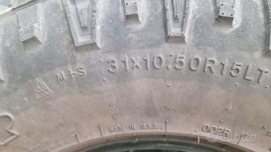 Vendo 4 pneumatici Good Year Duratrac 31x10.50R15LT anno 2014 appena rimossi da Nissan Patrol Gr per eccessiva rumorosità. Ottimi per uso fuoristrada. Pneumatici 4 stagioni M+S. Battistrada al 40/50%. Ritiro in loco.