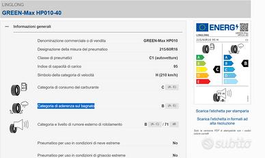 Vendesi nr. 1 treno penumatici estivi Linglong GREEN - Max HP 010 215/60 R16 - 95 H, per errato acquisto. Categoria di consumo del carburante: C Classe su bagnato: B