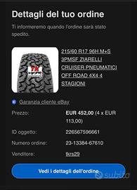 Vendo per errato acquisto treno pneumatici 215/60 R17 96H M+S 3PMSF ZIARELLI CRUISER PNEUMATICI OFF ROAD 4X4 4 STAGIONI. Pneumatici nuovissimi, mai montati, pagati 450€, vendo a 400€ (leggermente trattabili).