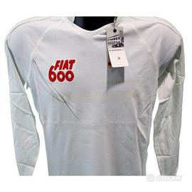 Polo di cotone bianca con logo Fiat 600 ricamato in alta definizione davanti sopra alla scritta in bianco grigio stampata "derivation ABARTH 750".
