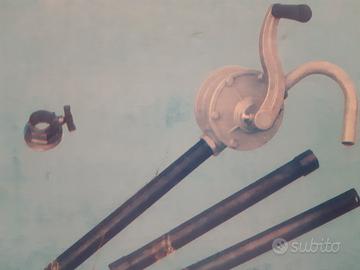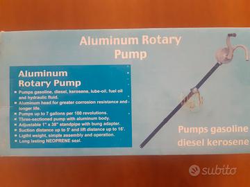 Pompa a mano rotativa, adatta per il travaso di benzina, gasolio, kerosene, olio lubrificante e idrocarburi in genere. Corpo in alluminio resistente alla corrosione e alla ruggine. Pompa nuova mai usata ancora nella sua scatola originale. Completa di tubo di aspirazione e raccordo per adattarla sul tappo dei fusti da 200 litri.
