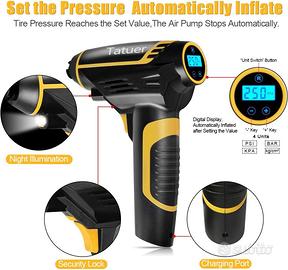 Tatuer Compressore Aria Portatile Auto Pompa Senza Fili per Auto Digitale ed elettrica con 150 PSI 4 ugelli e luci LED Batteria Ricaricabile agli ioni di Litio 12V