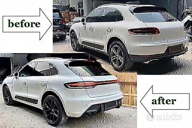 Porsche Macan dal 2014 al 2019 Bodykit aggiornamento modello 2023 kit completo per aggiornare la vostra Porsche Macan dal 2014 al 2019 al modello 2023 con tutta la fanaleria a led Il bodykit è in materiale plastico ABS di alta qualità e comprende: Paraurti anteriore con luci diurne DRL Fanali anteriori full led Paraurti posteriore Set terminal di scarico sx-dx in acciaio inox di colore nero Portellone posteriore in alluminio di alta qualità Fanaleria posteriore full led Accessori e modanature varie NOTA: Non occorrono modifiche o codifiche o ulteriori cablaggi per il montaggio della fanaleria che funziona perfettamente subito Nessuna segnalazione di errore Codice: ERSTCPO062067016015PO181100 LE PARTI DEL BODYKIT SONO FORNIBILI ANCHE SINGOLARMENTE PARAURTI ANTERIORE Codice: ERSTCPO0621100 PARAURTI POSTERIORE Codice: ERSTCPO0671100 SET FANALI ANTERIORI FULL LED Codice: ERSFAPO0161100 PORTELLONE CON FANALERIA A LED Codice: ERSSPPO181100 CON LED ROSSO-FUME' (foto n.10-11) Codice: ERSSPPO181100 CON LED TRASPARENTE CHIARO (foto n.12-13) Contattateci per info e prezzi Spedizioni in tutta Italia