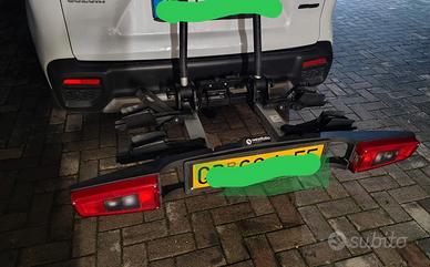 Porta biciclette biposto pieghevole da gancio traino, indicato anche per E-Bike con ruote a sezione larga. Marca Westfalia, fanali a led, completo di tre supporti di aggancio di tre misure diverse. ottime condizioni pari al nuovo e completo di chiavi antifurto sia del supporto e degli agganci. peso kg 17.