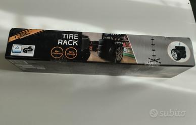in vendita un porta gomme con cerchio della inea C&C Automoive , è progettato per lo stoccaggio di 4 ruote , questo modello è a colonna ideale per porre una sopra l'altra le ruote e ottimizzare lo spazio in garage