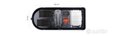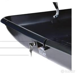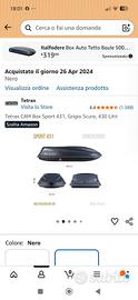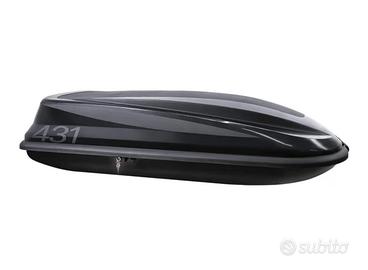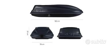 vendo praticamente nuovo eusato solo 2 volte per passaggio adatto grande. acquisto su amazon MarchioTetrax MaterialePolipropilene (PP) Dimensioni del prodotto183L x 74l x 39H cm ColoreNero Peso articolo 16 kg Resistente all'acqua MADE IN ITALY Box colore grigio scuro, universale adatto a qualsiasi tipo di barra portatutto, capacità 430 litri Fondo nero in polipropilene iniettato pp, presenza di inserti interni e punti di fissaggio per evitare che il contenuto scivoli; fondo piatto per ridurre eventuali tubolenze e rumori durante la marcia Sistema di fissaggio standard, pratico, veloce ed adatto per qualsiasi barra portatutto Serratura di sicurezza