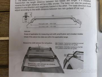 Causa misure sbagliate, vendo portabagagli universale con chiavi per auto 5 porte mai montato nuovo con scatola. Allego foto con misure del tetto (1050mm-1090mm tra una guarnizione del tetto e l altra)