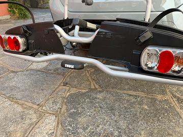 Vendo pellisso portabici per gancio traino Thule per due biciclette,praticamente come nuovo,lho usato solo per un paio di viaggi,le foto oarlano da sole.