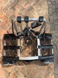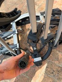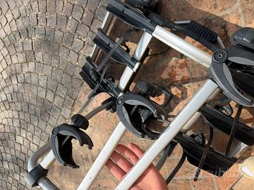 Portabici da gancio traino marca THULE per 3 biciclette, usato pochissimo, come nuovo. Perfetto per il trasporto di bici di grandi dimensioni e pesanti, come e-bike, fatbike o mountain bike, ma ideale anche per city bike e biciclette per bambini. I bracci di fissaggio al telaio sono removibili per semplificare il carico. Dispone di pratico meccanismo basculante azionabile con il pedale, che consente di aprire il bagagliaio anche con le bici montate. Sistema antifurto con doppia serratura: blocca sia le bici sul portabici sia il portabici al gancio traino. Adatto a telai con diametro dei tubi da 20 a 80 mm e pneumatici fino a 3". Portata totale: 51 kg, peso massimo per singola bici: 25 kg. Dimensioni: 73x103x79 cm (73x103x31 cm da chiuso). Peso complessivo: 16kg. Spazio tra le biciclette: 19 cm. Spina elettrica a 13 poli. Ritiro esclusivamente a mano, non spedisco