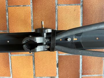 Portabici da tetto con barre porta carichi e due staffe per due bici. Gli agganci presenti sono su barre (si possono cambiare), fissaggio con chiave a brugola e chiusura antifurto con chiave sui fissaggi a tetto. Completo di tutte le cinghie ferma ruota.