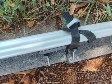 Il modello è composto dalla piastra anteriore con il perno per fissare la forcella ed il basamento lungo (che consente l'adattamento ad ogni modello di barre portatutto) per un sicuro fissaggio del pneumatico posteriore.
