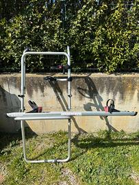 Portabici Fiamma Carry Bike Vivaro / Trafic / Talento D Usato ma in buono stato. Acquistato nuovo nel 2023 per il mio opel vivaro Solo un piccolo bollo bella parte inferiore come da foto ma non ne pregiudica utilizzo ne stabilità. In piu manca uno dei 4 coperchietti laterali per coprire la guida delle ruote.( solo fattore estetico). Prezzo non trattabile. Con Fiamma Carry-Bike, potete trasportare fino a due biciclette in tutta sicurezza sulla porta posteriore sinistra del vostro veicolo. Il portabici si adatta a diversi modelli delle serie Renault Trafic, Opel Vivaro, Fiat Talento e Nissan Primastar con doppia porta posteriore (H1). La porta può essere aperta facilmente anche quando il portapacchi è montato (senza biciclette). La staffa superiore è stata progettata in modo che la terza luce del freno rimanga visibile.