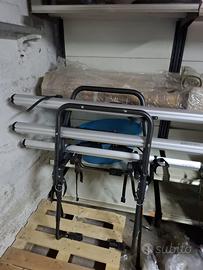 Portabici posteriore con struttura in acciaio e corsie in alluminio. Richiudibile per un agevole rimessaggio e trasporto e semplice da montare sul retro dell'auto con cinghie e supporti in gomma antigraffio. Compatibile con E-bike, portata di 3 bici e 45kg di carico massimo.