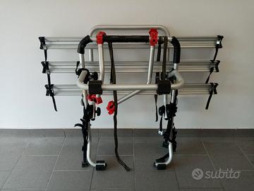 Vendo portabici posteriore universale per 3 bici, facile installazione con tre punti di ancoraggio, 2 bracci per fissaggio bici