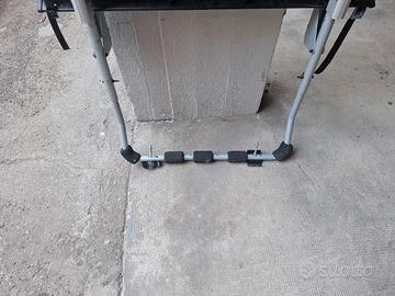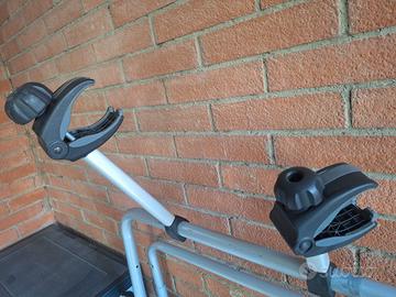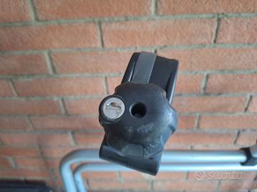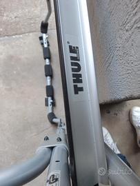 Portabici marca Thule del 2017, in ferro e parti in plastica, per installazione libera sul retromacchina con agganci rapidi superiori e inferiori, con n.2 pedane e agganci per 2 bici. morsettoni di sicurezza da stringere sulle canne delle bici, di cui quello piu esterno con chiusura a chiave per antifurto.