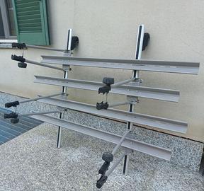 Porta biciclette per 4 bici, completo e montato sulle barre portatutto in alluminio, usato 2 volte e poi riposto in garage, vendo completo di tutti i relativi accessori/ricambi originali, chiavi, istruzioni. Marca: Green Valley Portata Max: 75 kg