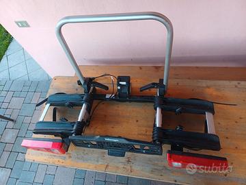 Vendo portabiciclette originale VW Premium per gancio traino, accessorio originale al 100% Volkswagen, caratteristica peculiare: è il supporto più leggero della sua classe e tipologia. Come si vede nella foto è estremamente compatto una volta piegato, e una volta attaccato alla macchina è incredibilmente essenziale (sembra sospeso). Ha cavo che si collega per attivare fanali posteriori, che funzionano in sincronia con i fanali della macchina. Comprato nel 2019 è stato usato dai miei genitori poco, e per piccole gite nel circondario. Disponibilissimo a farlo visionare e provare. In rete lo vedo ancora in vendita allo stesso prezzo di quando i miei genitori lo avevano comprato, sui 600 euro. Conservato con cura, ancora perfetto, e con libretto istruzioni e la sua sacca da trasporto.
