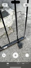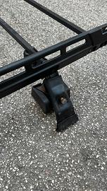 Portapacchi robusto in acciaio verniciato nero, ideale per trasporto bagagli, valigie, attrezzatura o box. Struttura solida, completo di 4 supporti con gommini per fissaggio alle barre longitudinali. Usato, in buone condizioni, normale segno d'uso ma perfettamente funzionale. Dimensioni indicative: - larghezza circa 93 cm - altezza montanti circa 1 m Facile da montare e smontare. Vendo per inutilizzo.