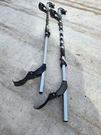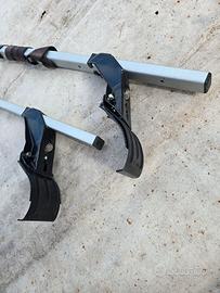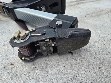 Portapacchi auto in alluminio e staffe in metallo con cinghie e rulli tendicinghie.