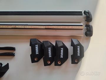 Vendo coppia di barre portatutto trasversali Thule 711500 (lung.150cm) dotato di canaline a T per fissaggio di accessori (es. porta sci ecc..) e relativo sistema di fissaggio come da foto. io le avevo montate su un volkswagen t6, le vendo perché ho montato quello della frontrunner.