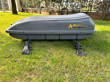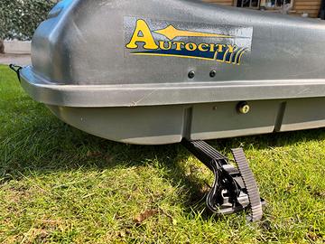 Portaoggetti per tetto auto, marca Autocity mod. 23350. Portata 50 kg. Adatto a tutte le auto dotate di barre portatutto (la larghezza dei supporti è regolabile). Ognuno dei 4 punti di fissaggio è dotato di chiave di sicurezza (fapa). Anche il box è dotato di chiave. N.B. I braccetti di apertura sono scarichi e per mantenere aperto il box nelle fasi di caricamento o scaricamento, viene fornito un apposito elemento in acciaio (come da foto) che consente di eseguire le operazioni in comodità e sicurezza.