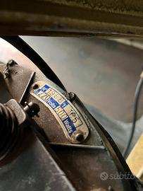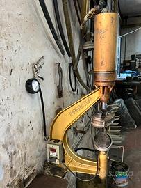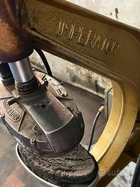 Pressa industriale pneumatica per assemblaggio o fissaggio dopo una riparazione su pneumatici, della marca Imperator. Struttura in ghisa dorata ad azionamento verticale tramite pistone e pneumatico superiore. Testa di pressatura intercambiabile e di fatto su due che ne porta, quella inferiore andrebbe cambiata (anche se comunque funzionante) cosi come visibile dall’ultima foto.