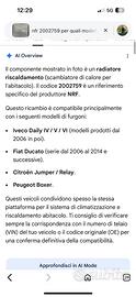 Il componente mostrato in foto è un radiatore riscaldamento (scambiatore di calore per l'abitacolo). Il codice 2002759 è un riferimento specifico del produttore NRF. Questo ricambio è compatibile principalmente con i seguenti modelli di furgoni: • Iveco Daily IV / V / VI (modelli prodotti dal 2006 in poi). • Fiat Ducato (serie dal 2006 al 2014 e successive). • Citroen Jumper / Relay. • Peugeot Boxer.