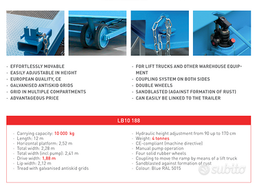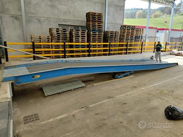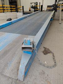 Rampa di carico per muletto o carrello elevatore, acquistata 2020, usata poche decine di volte all'anno. in vendita causa inutilizzo. Perfettamente funzionante. Lunghezza 12 metri, passaggio ruote muletto filo sponda sicurezza 187cm. Peso 4000kg, Portata 10.000kg. possiamo fornire fattura di acquisto 2020. Ritiro presso Cooperativa sociale La Fraternità. Via Galilei, 24, Mercatale di Ozzano Emilia, (Bologna).