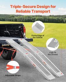 • Venditori Affidabili di Esperienza • Spediamo ovunque, anche in Contrassegno • Vendiamo solo articoli Nuovi di prima qualità • Contattaci per qualsiasi info necessaria Capacità di carico di 1000 libbre/453,59 kg: questa rampa arcuata supporta una capacità di carico combinata fino a 1000 libbre/453,59 kg, offrendo un design leggero ma resistente. Il set da 2 pezzi è ideale per il trasporto di ATV, UTV, motociclette, tosaerba a spinta e scooter elettrici Rampa in acciaio: la struttura interamente in acciaio presenta saldature di precisione con giunti sigillati ermeticamente, una superficie zincata bianca per resistere alla corrosione e una finitura liscia e senza sbavature Stabilità antiscivolo: progettata con piastre di gomma a tre dita, la rampa afferra saldamente il bordo del pick-up, evitando spostamenti durante l'uso. Il motivo della superficie antiscivolo assicura un trasporto sicuro in salita. Nota: evitare di superare la capacità di carico consigliata per prolungare la durata della rampa Rinforzata con cinghie: dotata di cinghie di fissaggio regolabili, la rampa si fissa saldamente al bordo del pick-up, riducendo al minimo i movimenti ed evitando scivolamenti o spostamenti durante il carico, garantendo un trasporto del veicolo stabile e sicuro Design pieghevole rapido: la rampa si piega e si apre in 1 secondo, con giunti triangolari rinforzati per un funzionamento fluido. Una maniglia in gomma la rende facile da trasportare e il suo design compatto si adatta comodamente a garage o bagagliai di auto senza occupare molto spazio