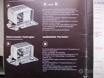 Per Alfa Romeo Giulia,Alfa 2000,GT 1300/1600,GTV 2000,Duetto,Alfetta,Montreal-Porsche 911 e 914-BMW 1602 e 2002,vendo regolatore di tensione separato per alternatori "Bosch".Sostituisce il tipo montato di primo impianto,avendo questi vantaggi:massima operatività dei transistor al silicio-Nessun blocco perchè senza contatto-Soppressione delle interferenze,particolarmente adatto per veicoli con telefono,impianti stereo e antenne al parabrezza-Perfettamente funzionante alle temperature da -30° a +75°-Maggiore durata della batteria-Compensazione della temperatura,ovvero adattamento preciso al rispettivo livello di carica della batteria.Ricambio nuovo,originale "Bosch".