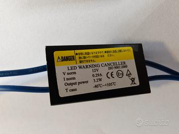 Vendo due resistenze led canceller T10 per errato acquisto, NUOVE. 12V, 0,29A, 3,2W. Servono a far funzionare le lampadine led T10 (posizione, plafoniera, targa ecc.) senza errore sul quadro e senza malfunzionamenti tipo sfarfallio. Plug and play molto semplici da collegare. Per qualsiasi informazione non esitate a contattarmi.