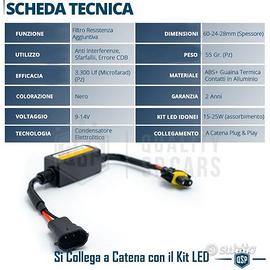 2 Filtri CANbus Professionali Per KIT di TRASFORMAZIONE FULL LED 9012 | Resistenza Aggiuntiva Spegni Spia, Lampeggi, Cancella Errore | Da Collegare a Catena PLUG and PLAY, NO MODIFICHE. - Plug and Play (Connettori 9012) - Qualità dei materiali usati - Rimuove La Spia Errore - Rimuove Lampeggi e Sfarfalii - Rimuove Interferenze Radio COMPATIBILITÀ - KIT FULL LED 9012 INFO: Centralina CANbus Aggiuntiva, per Installazione di Lampadine LED 9012. Cancella Errori e Anomalie di Funzionamento su Luci Abbaglianti, Anabbaglianti, Fendinebbia ecc... Costruita con Materiali ad Alta Resistenza e Rifinitura, con Corpo e Connettori in ABS. MINOR INGOMBRO GARANTITO E' attualmente il Filtro a Condensatore Elettrolitico PIU' PICCOLO presente in commercio POSSIEDE PRESA 9004 COME LA VOSTRA AUTO non richiede forature o adattamenti del cablaggio, Si collega Plug and Play CANBUS NO ERRORI - NO LAMPEGGIO - NO INTERFERNZE RADIO dotato di Condensatore da 3.300uf (Microfarad) 9-14V, Idoneo Per Kit Led Con Assorbimento 15-25W SCHEDA TECNICA: - Colore: Nero Opaco - Materiale: Guaina Termorestringente e Pvc - Condensatore Interno: 3.300uf (Microfarad) 9-14V - Lunghezza (mm): 60 - Larghezza (mm): 24 - Spessore (mm): 28 - Tecnologia: Condensatore Elettrolitico - W: 40W - Resistenza a polveri ed Acqua: IP65 - Peso: 51Gr (Singolo) - Applicazione: Solo collegamento - Confezione o Scatolo: Busta Plastica - Condizioni: NUOVO PER INFO CONTATTARE AL 3927091031 ANCHE LINEA WhatsApp OPPURE VIA E-MAIL: rtautoitalia2018@libero.it CONSEGNA: - Effettuiamo Spedizioni 24-48H in TUTTA ITALIA - Ritiro in Sede con Possibilità di Visionare il Prodotto - Vendiamo solo Articoli Nuovi PAGAMENTI: - PayPal - Con Carta - Bonifico Bancario - Alla Consegna con Contrassegno