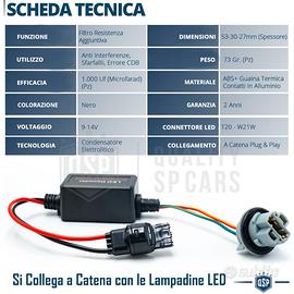 2 Filtri CANbus Professionali Per Lampadine LED T20 W21W | Resistenza Aggiuntiva Spegni Spia, Lampeggi, Cancella Errore | Da Collegare a Catena PLUG and PLAY, NO MODIFICHE. - Plug and Play (Connettori T20 - 7440 - W21W) - Qualità dei Materiali Usati - Rimuove La Spia Errore - Rimuove Lampeggi e Sfarfalii - Rimuove Interferenze Radio COMPATIBILITÀ - Con Lampadine LED T20 - 7440 - W21W INFO: Centralina CANbus Aggiuntiva, per Installazione di Lampadine LED T20 W21W. Cancella Errori e Anomalie di Funzionamento su Luci di Posizione, Luci Diurne DRL, Luci di Retromarcia, ecc... Costruita con Materiali ad Alta Resistenza e Rifinitura, con Corpo e Connettori in ABS. POSSIEDE PRESA T20 - W21W COME LA VOSTRA AUTO Non richiede forature o adattamenti del cablaggio, Si collega Plug and Play CANBUS NO ERRORI - NO LAMPEGGIO - NO INTERFERNZE RADIO Dotato di Condensatore da 1000UF (Microfarad) 12V SCHEDA TECNICA: - Colore: Nero Opaco - Materiale: Guaina Termorestringente e Pvc - Condensatore Interno: 1000uf (Microfarad) 12V - Lunghezza (mm): 53 - Larghezza (mm): 30 - Spessore (mm): 27 - Tecnologia: Condensatore Elettrolitico - W: 8W - Resistenza a polveri ed Acqua: IP67 - Peso: 73Gr (Singolo) - Applicazione: Solo collegamento - Confezione o Scatolo: Busta Plastica - Condizioni: NUOVO PER INFO CONTATTARE AL 3927091031 ANCHE LINEA WhatsApp OPPURE VIA E-MAIL: rtautoitalia2018@libero.it CONSEGNA: - Effettuiamo Spedizioni 24-48H in TUTTA ITALIA - Ritiro in Sede con Possibilità di Visionare il Prodotto - Vendiamo solo Articoli Nuovi PAGAMENTI: - PayPal - Con Carta - Bonifico Bancario - Alla Consegna con Contrassegno