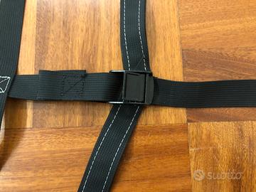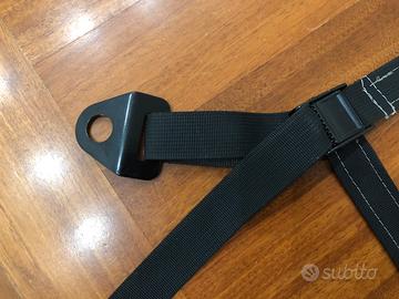 Può essere montata in diversi modi, ad esempio utilizzando le piastre collegandole ai bulloni delle cinture di sicurezza oppure usando semplicemente i suoi lacci più lunghi (anch’essi in cordura quindi resistentissimi).