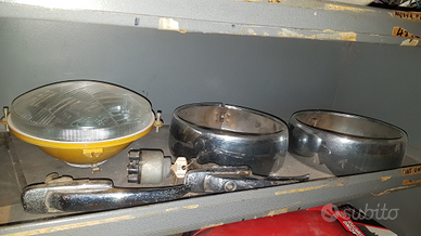 Cruscotto, strumento, faro, maniglie, sospensione posteriore completa, scendente, vetro fisso, tandem tergicristalli completo di motore, staffe, motorino avviamento, raschiavetro cornici scendenti NUOVI.