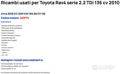RICAMBI PER TOYOTA RAV4 III 2.2 TDi 136 cv 2010
