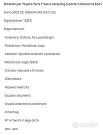 RICAMBI PER TOYOTA YARIS I RESYLING 5 PORTE 1.0 65