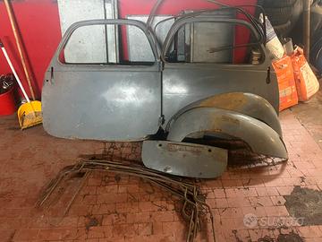 Si vende ricambi fiat topolino c , parafanghi posteriori , bauletto posteriore , 2 porte destra e sinistra ma quest ultime con un po di corrosione come da foto , telaio cappotta e raschiavetri . Solo ritiro a nano o se mandate voi il corriere , no perditempo e offerte