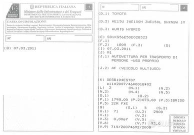 RICAMBI TOYOTA AURIS 1.8 HYBRID ANNO 2011